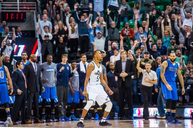 Game two, thankfully, is much different as the Jazz come out with some hot shooting and tough defense to take a 59-48 lead at halftime. Rodney Hood especially is hot, hitting a half-court shot off the glass at the intermission buzzer. Having some fun, he shimmies in front of Austin Rivers, who is sitting in street clothes having dealt with a hamstring injury.