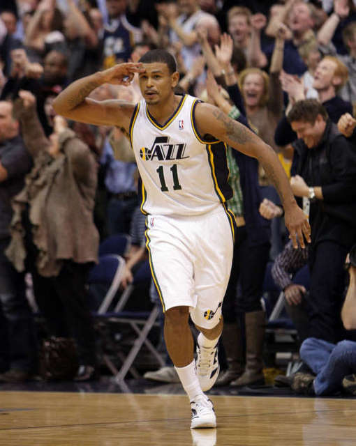 Utah Jazz point guard Earl Watson (11) salutes the crowd after sealing the Jazz victory with a 3 pointer against the Lakers in Salt Lake City Saturday, Feb. 4, 2012. The Jazz won 96-87.