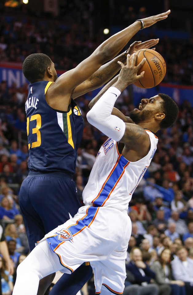 Utah’s Royce O’Neale (23) defends Oklahoma City’s Paul George (13) during an NBA basketball game between the Oklahoma City Thunder and Utah Jazz at Chesapeake Energy Arena in Oklahoma City, Wednesday, Dec. 20, 2017. Oklahoma City won 107-79. Photo by Nate Billings, The Oklahoman
