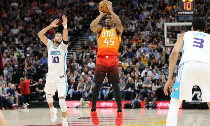Feb 9, 2018; Salt Lake City, UT, USA; Utah Jazz guard Donovan Mitchell (45) shoots an open jump shot during the fourth quarter against the Charlotte Hornets at Vivint Smart Home Arena. Utah won 106-94. Mandatory Credit: Chris Nicoll-USA TODAY Sports