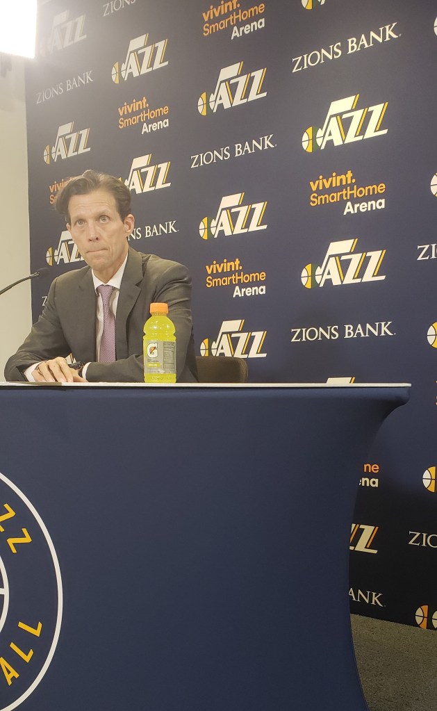 I met Ryan McDonald, of the Des, at the J-Note at 4:45 and he took me around to get my pass and begin the journey down into the basement of Vivint. For three levels, we went down into a cement cave surrounded by pipes and construction equipment. By 5:15, we were in a room, better categorized as an oversized closet, for Coach Quin Snyder’s pre-game press conference.