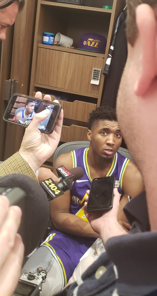 Once DM was finished, everyone shifted onto Rudy Gobert. I had debated all night how to act in front of Mitchell as I am a fan first and writer second. I love his game and love the guy’s off-court attitude and personality. I wanted to take a picture but that would be too unprofessional. Could I ask for an autograph? What if I lied a little and said it was for my son? I was too nervous, and too conflicted, to do either so as he walked by I looked at him and whispered, “I’m new at this media thing, but I just wanted you to know I’m a big fan and I just love ya.” He looked back at me, straight into my eyes!, and lit up with a big grin and said, “appreciate it.” To which I said, “anytime brother” and gave him a fist bump