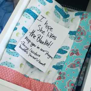 Baxter is the baby across from Navy. Baxtor has the sweetest mama (and if we are being judgmental, the youngest mama, too) who has constantly asked us how we are, if we’ve had dinner yet, or if there’s anything we need from her. Baxter’s Grandma is also a sweetheart, stitching together a blanket for Navy Rose. Coming to our space one night, we opened our parent drawer to find the blanket and a note that read: “I hope she likes the blanket! Keeping you in our prayers.”
