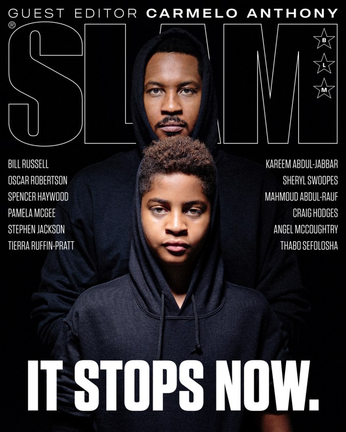 As the Black Lives Matter was growing in the USA, it was also growing inside the NBA as its stars, like James, were speaking out. Carmelo Anthony was another strong voice, so it was no surprise to see him grace a special edition issue dedicated to BLM with his son in matching black hoodies. Within that monumental issue, current and former stars wrote first-person essays with their experiences with injustice and their pursuit of equality. The headlining essay was written by Russell.