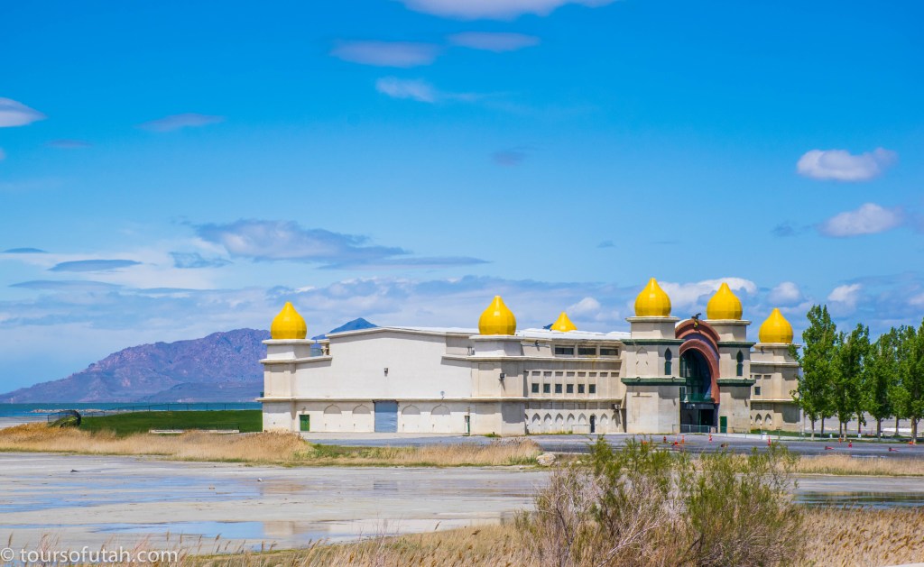 As soon as you can, you hop onto Legacy Highway and drive into the sunset, West, and West some more, and then a little more West as the Great Salt Lake comes into view with sunflowers growing atop white sandy beaches that stretch along the horizon and historic coastline sketches from yesteryear weave in and out along the way to display a fisherman here, a pair of lovers admiring the view there, and then a palace from Aladdin, complete with four mustard-colored dole whip twirls on each rooftop corner, springs up from the desert like a Sultan in the sand: The Great Saltair.