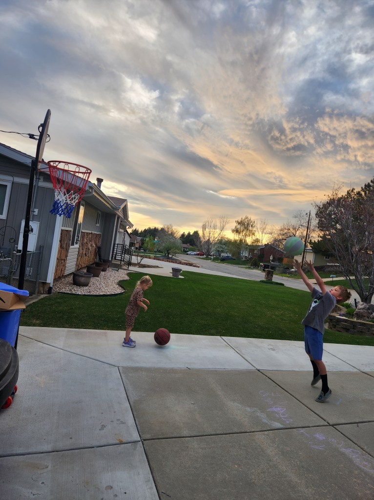 All the while, the sky turned blue and the sun popped out as the seasons transitioned from dark winter to daylight-saving spring, which gave way to groundhogs, flower blooms, and the basketball hoop for the driveway. He started dribbling every day. Shooting every day. So did His Little Sister. Shooting hoops became a regular occurrence.
